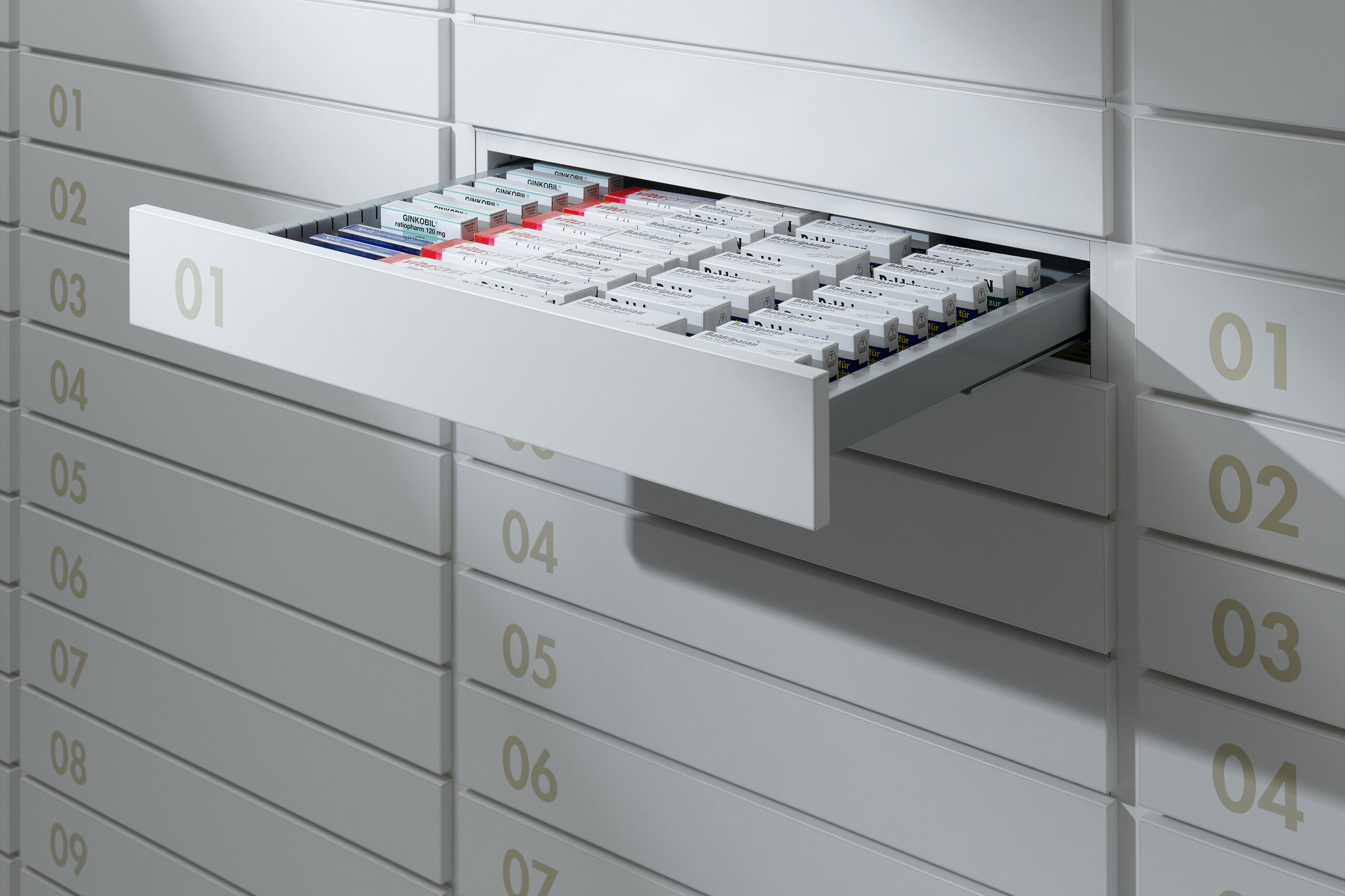 Detailaufnahme von schmalen weißen Medikamentenschubläden mit dezenter Nummerierung und sichtbarer Medikamentenaufteilungen.